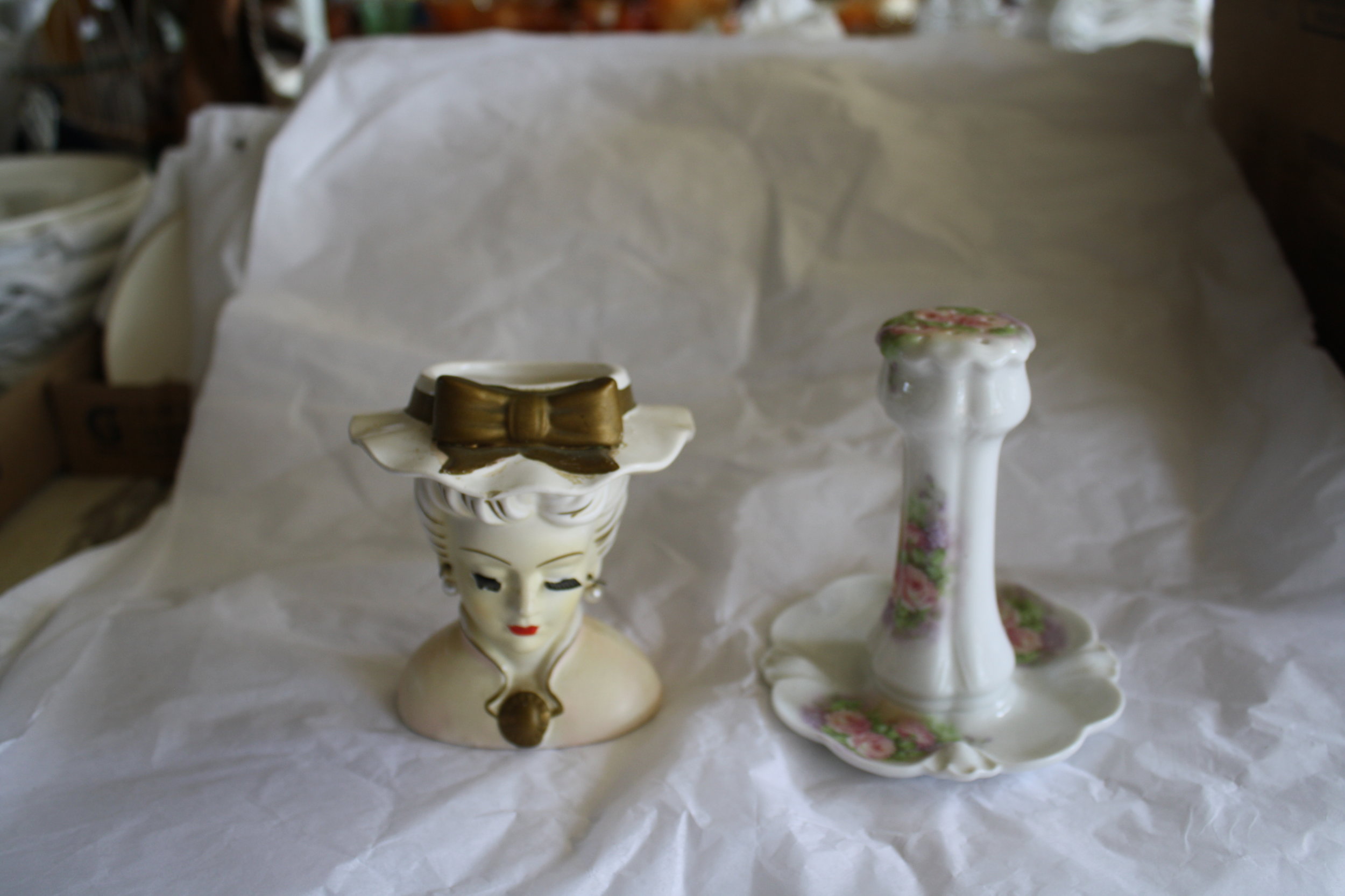 Glassware: Star & File dishes, vases; Iris & Herring bone dishes; Orange Tree dishes; golden wheat dishes; leaf dishes w/water pitcher, cream/sugar, S&P, gravy boat; Avon cape cod, perfume bottles; Farberware pots/pans; strainer; cheese grater; glass baking dishes; casserole dish w/lid, roasting pans, hamburger press; glass/ceramic oil lamps; tea pots; Jap tea set; child’s tea set; gravy boat (Tilso); gravy boat (Georgian); serving platter; knick knacks, ceramic cat figurines; hob knob items; glass pitchers/glasses; “Every Day” Fire Kingware dishes; cruets; juicer w/handle; chicken candy dish; etc.