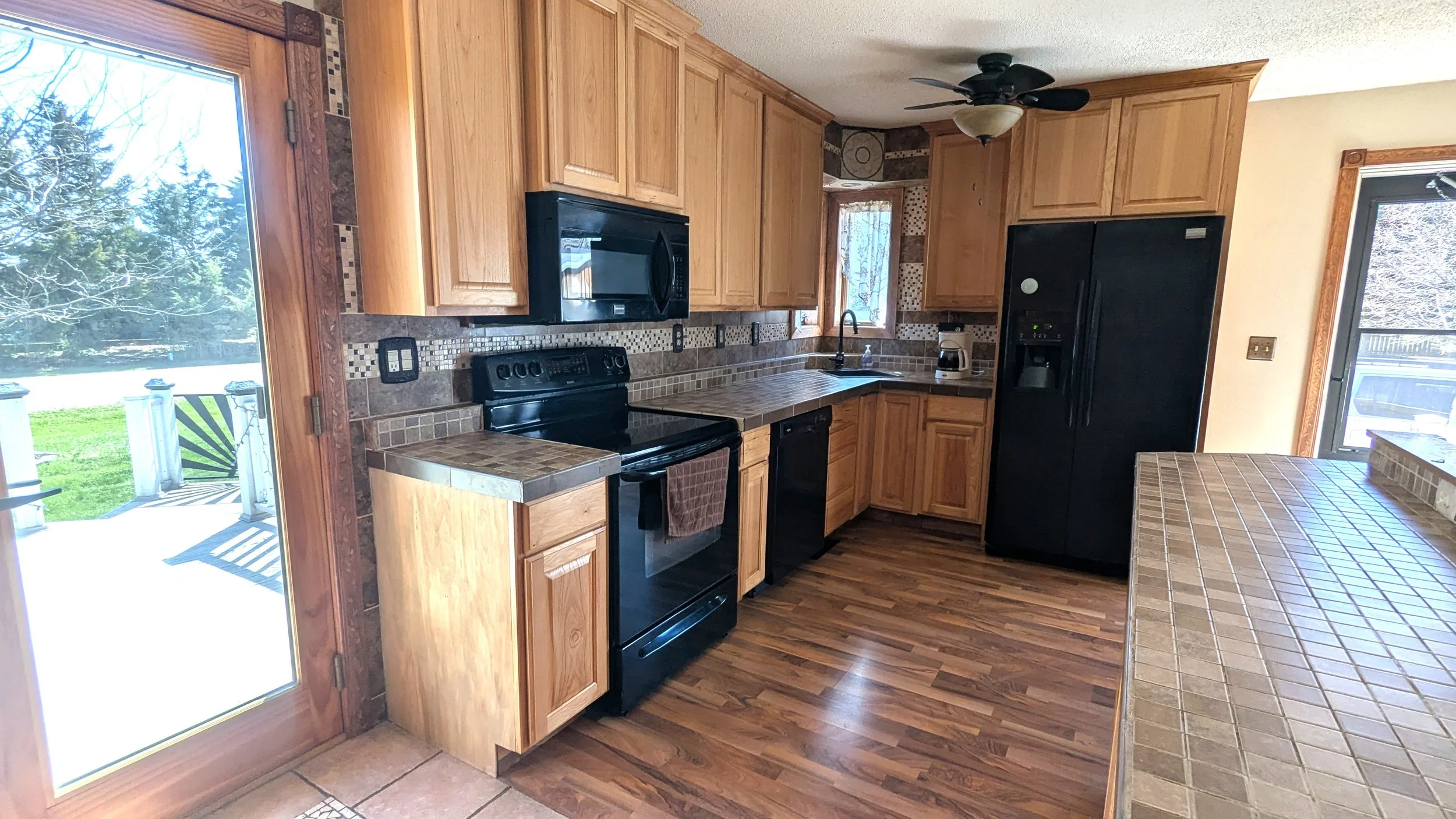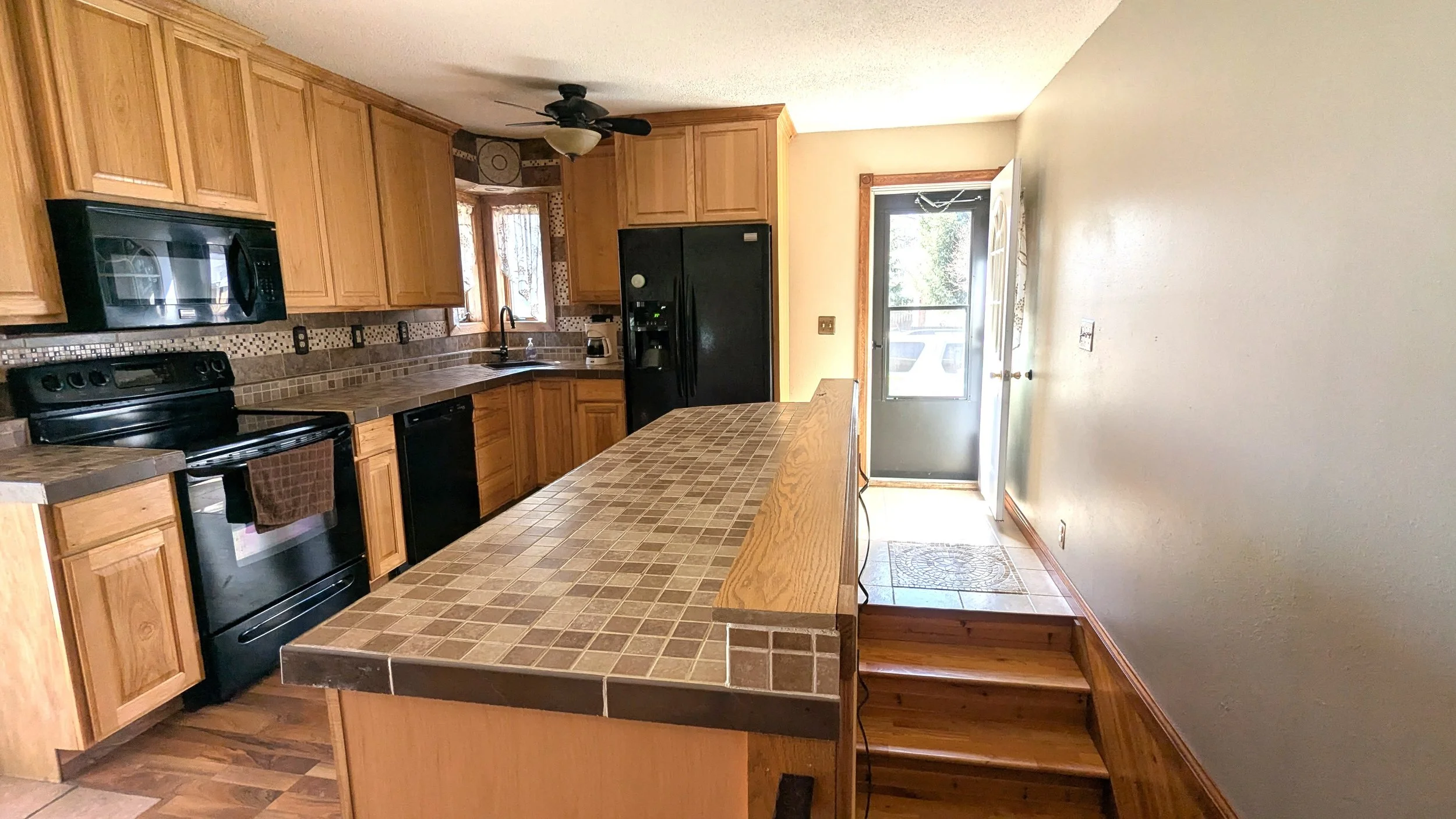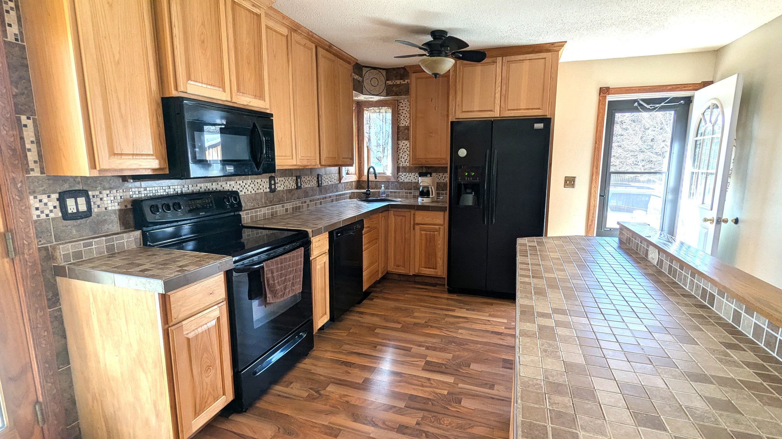 The HVAC system consists of a high-efficiency propane furnace and central air conditioning, while the water heater is electric. All appliances will remain with the house.