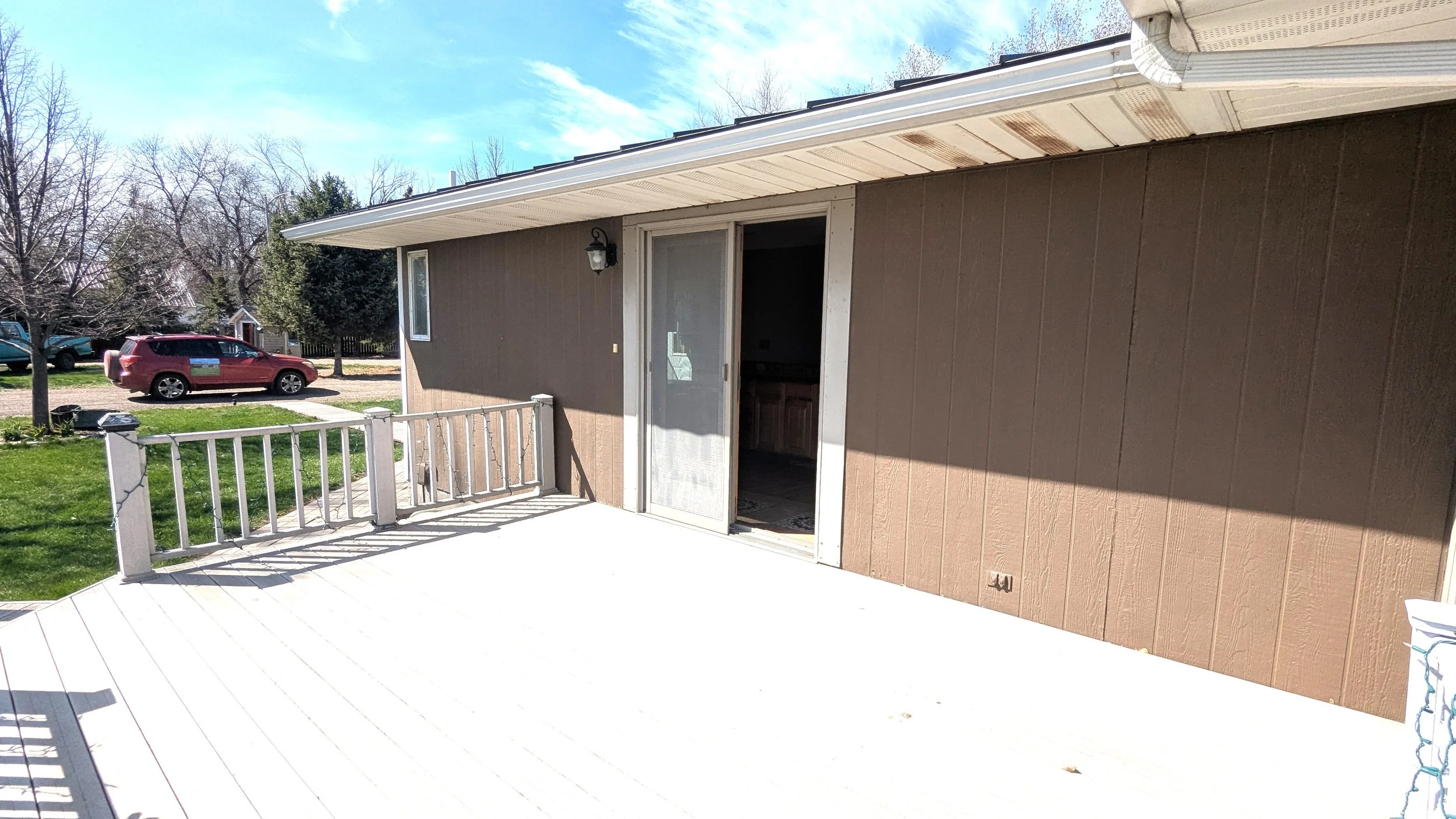 This auction features a single-story, 960 sq. ft. wood-frame house with a 216 sq. ft. composite deck. The house is equipped with a vinyl patio door, metal roof with vertical wood siding, Anderson vinyl windows, and aluminum gutters and downspouts. The main floor presents an open concept kitchen and dining area, which includes a brick fireplace and a living room. There are also two bedrooms and a full bathroom A southern exposure provides abundant natural light during winter.